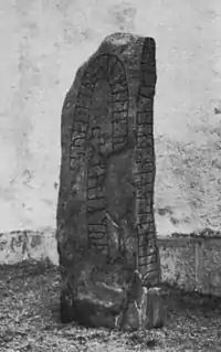The inscription on this gneiss runestone, which is 2.2 meters in height, consists of runic text inscribed in the younger futhark in three text bands, the first band, marked as "A" in the transliteration of the runes, along the side of the stone, and two band marked as "B" with one forming an arch over a cross and the second directly below the cross. The text is damaged at the end of the first line of text band "B", but the words have been interpolated based upon similar inscriptions. The inscription was first noted in 1844 by vicar A. R. Lindroth when the materials from a Medieval church was being used in the construction of a new church.[1] Before the historic significance of runestones was understood, they were often reused in the construction of roads, bridges, and buildings such as churches. Lindroth noted the location in the wall of the new church where the stone was being placed. On October 14, 1964, the Swedish National Heritage Board supervised the removal of the stone from the church wall and raised it on the church grounds.[1]