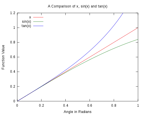 The opposite leg, O, is approximately equal to the length of the blue arc, s. Gathering facts from geometry, s = Aθ, from trigonometry, sin θ = O/H and tan θ = O/A, and from the picture, O ≈ s and H ≈ A leads to: