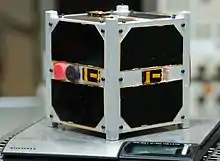 A CubeSat[28] is a common type of nanosatellite,[25] built in cube form based on multiples of 10 cm × 10 cm × 10 cm, with a mass of no more than 1.33 kilograms (2.9 lb) per unit.[29] The CubeSat concept was first developed in 1999 by a collaborative team of California Polytechnic State University and Stanford University, and the specifications, for use by anyone planning to launch a CubeSat-style nanosatellite, are maintained by this group.[29]