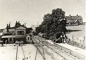 Smeeth, a scattered village community of a few hundred persons in the early 1840s, was initially ignored by the South Eastern Railway (SER) when it constructed its main line through the area to reach Folkestone. Situated 4.5 miles (7.2 km) from Ashford, the small village was primarily a farming community producing wheat, barley, oats, beans and peas; the grain was processed at Evegate Mill on the River Stour to the south of the railway line, which was the most substantial structure in the area.[2] In 1850, six years after opening the South Eastern Main Line, a deputation of local tradesmen pressed the SER to open a station in the village, arguing that the potential goods traffic that could be generated would outweigh the lack of passenger receipts. Although there was little to suggest that Smeeth could justify and support a railway station, the SER agreed to the venture. A site was chosen 1 mile (1.6 km) to the south of the village at a point where the Bonnington to Smeeth road (now the B2069) crossed the railway line. The land was owned by the Knatchbull-Hugessen family, Sir Edward Knatchbull-Hugessen being the local Member of Parliament and, in later years, a director of the SER.[2]