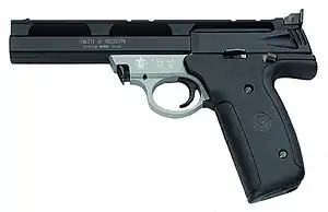 The Smith & Wesson Model 22A is a semi-automatic pistol that was manufactured in Houlton, Maine. The 22A is a full-size pistol with an aluminum alloy frame. The steel barrel has an integrated Weaver style rail (similar to a Picatinny).