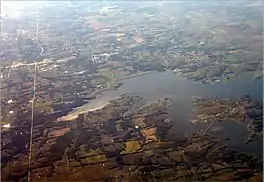 Lower portion of the lake from the east. The dam is the flat area on the upper left