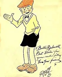 The strip featured young office boy Smitty, his six-year-old brother Herby, his girlfriend Ginny and his dog Scraps. Other characters were Smitty's boss, Mr. Bailey, and the Indian guide, Little Moose. Berndt based the strip on his own experience as an office boy, recalling, "I learned the tricks, shenangians and schemes of an office boy and became expert at them."[2] Berndt saw his creation as featuring "flashbacks of things you did as a young fellow."[2] As the strip progressed, the teenage Smitty aged to young adulthood (approximately 13 to 23) and eventually got married.