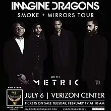 The Smoke + Mirrors Tour was the second worldwide concert tour by American alternative rock band Imagine Dragons in support of their second studio album Smoke + Mirrors (2015). The tour had a preview show in Sydney, Australia, on March 17, 2015, before the tour officially began in Santiago, Chile, on April 12, 2015. It continued through the Americas, Asia, Oceania and Europe until February 5, 2016, in Amsterdam, Netherlands. The band played 108 shows. For Pollstar's Year End Top 200 North American Tours of 2015, it was ranked forty-first, and grossed $25.2 million.[1]