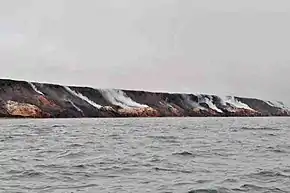 The Smoking Hills are located on the east coast of Cape Bathurst[1] in Canada's Northwest Territories, next to the Arctic Ocean and a small group of lakes. The cliffs were named by explorer John Franklin,[2] who was the first European to see them on his 1826 expeditions. They contain strata of hydrocarbons (oil shales), which have been burning continuously for centuries.