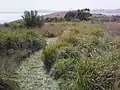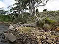 The terrestrial ecosystem of Smooth Island has been damaged by overgrazing and slashing-and-burning,[31] and through the commercial hunting of wildlife.[32] The island's natural vegetation has been largely displaced by exotic grass, thistle, bracken, scattered eucalypts and African boxthorn bushes. Between 0.86 ha (2.1 acres)[33] and 18 ha (44 acres) of shearwater rookeries are present on Smooth Island and the impact of repeated fires on these habitats has been studied.[31] The island' current owners intend to systematically restore its native ecosystem. Since March 2014, a diverse range of native Tasmanian flora have been planted throughout the island.[34] Remnant eucalypts are also expected to seed on the island's south-east coast since grazing has ceased.