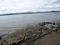 Smooth Island consists of diabase or dolerite rock, a subvolcanic intrusion that probably occurred from 56 to 33.9 million years ago during the Eocene epoch of the Cenozoic era.[15] A geological survey identified consolidated, brownish, fine-grained quartz sandstone occurring on the island's north-east coastline at approximately 2 metres (6.6 ft) above sea level, covered by sand. It was said to be similar to the sandstone samples retrieved from South Arm that contained numerous fossils but no fossils were found in the samples taken from Smooth Island.[16][17] The western aspect of the island contains dolerite (tholeiitic) with locally developed granophyre from the Jurassic period. The water table is classified as a surficial sediment aquifer (porous media – unconsolidated).[18]