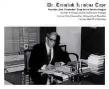 Principal Dr. Trimbak Krishna Tope was a distinguished jurist, former two-time Vice Chancellor of the University of Mumbai, former Sheriff of Mumbai, and the longest serving Principal of Government Law College, Mumbai. He was a firm believer in social service. He wanted to sensitize the law students about the real picture of the society, so that they work towards its betterment, selflessly, as law is an instrument of social change.