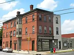 Smyser and English Pharmacy, also known as Leedom & Wissler Pharmacy, is a historic pharmacy building located in the Germantown neighborhood of Philadelphia, Pennsylvania. It was built in 1886–1887, and is a three-story, three bay rectangular brick building in the Queen Anne-style. It had a ground floor pharmacy, with offices and residences above. It features an ornamental cornice and terra cotta decorative details. The interior features ornate tiled fireplaces. It housed a pharmacy until 1997.[2]