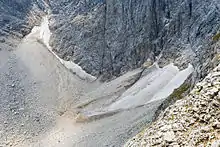 Snezhnika (Bulgarian: Снежника, "the snow patch") is a glacieret in the Pirin Mountains of Bulgaria, a remnant of the former Vihren Glacier.[1][2] The glacieret lies at an elevation between 2,425 m (7,956 ft) and 2,480 m (8,140 ft)[3][4] in the deep Golemiya Kazan cirque at the steep northern foot of Vihren (2,914 m (9,560 ft)), Pirin's highest summit.[5][6] Due to the relatively easy access and its location along a popular hiking trail, Snezhnika is Bulgaria's most famous glacieret.[7] Snezhnika has an average area of 0.01 km2 (0.0039 sq mi)[2] and in 2006 it had a volume of 30,000 m3 (1,100,000 cu ft).[8]