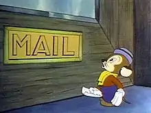 Director Chuck Jones created Sniffles as a potential new star for the studio in 1939.[2] The character was designed by Disney veteran Charles Thorson, an old hand at designing cute characters for Disney's Silly Symphonies. Thorson's design was highly derivative of a character he had designed for Disney, Abner Countrymouse from the Oscar-winning short The Country Cousin (1936). Both Abner and Sniffles are, in a word, cute. Sniffles' head is almost as large as his body, which allows his infant-like face to dominate his look. He has large, baby-like eyes, a small bewhiskered nose, and a perpetual smile. His ears grow from the sides of his head, placed so as to hearken more to a human infant than to Disney's top star, Mickey Mouse. The character wears a blue sailor cap, a red shirt, blue pants, a yellow scarf, white gloves and tan shoes. His fur is brown with light markings on the face.