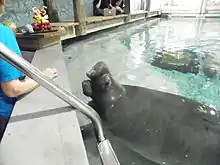 Snooty (July 21, 1948 – July 23, 2017) was a male Florida manatee that resided at the Bishop Museum of Science and Nature's Parker Manatee Aquarium in Bradenton, Florida. He was one of the first recorded captive manatee births, and at age 69, he was the oldest manatee in captivity,[1] and possibly the oldest manatee in the world. Due to his hand rearing from birth, Snooty was never released to the wild and was the only manatee at the museum's aquarium that had regular human interaction.[2]