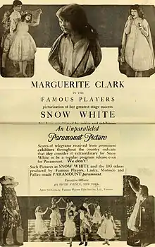 Snow White is a 1916 American silent romantic fantasy film directed by J. Searle Dawley. It was adapted by Winthrop Ames from his own 1912 Broadway play Snow White and the Seven Dwarfs, which was in turn adapted from the 1812 fairy tale (as collected by the Grimm brothers). The film stars Marguerite Clark and Creighton Hale, Clark reprising her stage role.[1]
