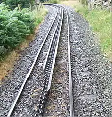 Following an accident in 1896, most of the line was fitted with 'gripper rails'. These are fixed to either side of the centre toothed rack rail and are of an inverted 'L' cross section. A 'gripper' is fitted to each locomotive, which fits around the gripper rails and holds the locomotive to the rails and prevents the pinion coming free from the rack. Although no other Abt rack railways use a gripper system,[27] other rack systems do.