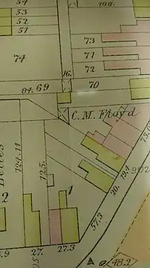 Although not many of the present structures are reflected by Sasche's diagram, it is historically accurate, as those two lots, in addition to the frame buildings dotted along the exterior of C.A. Snow's, were among the only to be granted a permit for construction as housing residences at this time (other more significant construction within the alley took place after this year represented). Such frame houses had in time been replaced with brick structures. In terms of preserved architecture, there are a few larger dwelling facilities that did not appear to have been in continued use, but were not razed as were condemned buildings in other squares (perhaps out of historical preservation, as some buildings were affixed with plaques detailing their significance).