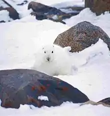 The habitat for some snowshoe hares has changed dramatically, leaving some habitats without snow for longer periods than previously.[42] Some hares have adapted and stay brown all winter. Others, however, continue to turn white in winter. These hares are at an increased risk of being hunted and killed because they are no longer camouflaged.[43] Many people in the scientific community believe that snowshoe hare populations are at risk of crashing unless interbreeding speeds up the process of evolution to year-round brown. Other species who rely on the hare as part of their diet are also at risk.[44][45]