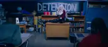Max is then shown sitting on top of the teacher's desk, as the word 'Detention' is written on the blackboard. The students stare at each other while she dances around them. In the next segment, Max performs a dance in a black blazer on top of a red shirt inside a football stadium with multiple students. She is then seen wearing red Beats by Dre headphones while standing next to a wall. The final segment shows Max walking onto the field with the students, as they socialize with each other while sitting down. She performs a belt on the field, as the students stand in a horizontal line, holding up their right hand under their mouth with the words 'So Am I' written in black ink. At the end of the line, Max places her right hand over her forehead and she falls backwards.