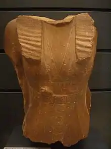 A handful of headless statues of Sobekneferu have been identified.[8][48][63] In one quartzite image, she blends feminine and masculine dress with an inscription reading 'daughter of Re(?), of his body, Sobekneferu, may she live like Re forever'.[48][63] On her torso rests a pendant modelled on that worn by Senusret III.[63] Three basalt statues of the female king were found in Tell ed-Dab'a;[64] two depict her in a seated posture, another shows her kneeling.[65][66] In one, she is depicted trampling the Nine Bows, representing the subjugation of Egypt's enemies.[8] The three statues appear to be life-sized.[66] One statue with her head is known. The bust was held in the Egyptian Museum of Berlin but was lost during World War II. Its existence is confirmed by photographic images and plaster casts. It fits on top of the lower part of a seated statuette discovered at Semna which bears the royal symbol smꜣ tꜣwy on the side of the throne.[67] The lower half is held at the Museum of Fine Arts, Boston.[68][69] There is a statuette in the Metropolitan Museum of Art in New York that has been suggested to represent Sobekneferu, though this assignment is unverified.[68] The schist bust depicts a woman in a wig, wearing a crown composed of a uraeus cobra and two vultures with outstretched wings which is of unknown iconography, and the ḥb-sd cloak.[48][70] The base of another statue bearing her name and identified as the representation of a king's royal daughter was discovered in Gezer, though it may also refer to a daughter of Senusret I or another unknown Sobekneferu.[71][72] A headless black basalt sphinx discovered by Édouard Naville in Khatana-Qantir bearing a damaged inscription is also tentatively assigned to Sobekneferu.