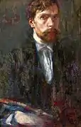 The immediate inspiration for the founding of the new society came from the ground-breaking art exhibit inaugurated on May 27, 1897 at Sukiennice in Main Square, Kraków.[2] It was held by Polish modernist painters,[2] and called A Separate Exhibition of Painting and Sculpture (Wystawa osobna obrazów i rzeźb).[3] The show was visited by approximately 6,000 guests, and proclaimed a success. The first meeting of Sztuka Society took place on October 27, 1897.[4] Among its founding members were a generation of academics from the School of Fine Arts who also participated in the show, including future Rectors of the Academy: Leon Wyczółkowski, Teodor Axentowicz, Jacek Malczewski, Józef Mehoffer; as well as artists Józef Chełmoński, Julian Fałat, Antoni Piotrowski, Jan Stanisławski, Włodzimierz Tetmajer and Stanisław Wyspiański.[2]