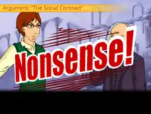 The gameplay of Socrates Jones: Pro Philosopher heavily borrows from that of the Ace Attorney series, modifying the catchphrase "Objection!" to "Nonsense!" to fit the game's topic.[18][19] The players can examine each sentence of their opponents and ask for clarification, ask for the sentence's relevance or ask the opponent to back up her his statement. Players can also challenge their opponents' claims by bringing up a counter-argument collected earlier in the argument. According to speakers at the 2014 ifMUD Interactive Fiction discussion, "the character has a set of things they need to explain/justify/come to terms with, and then a series of rhetorical moves they can make".[20]
