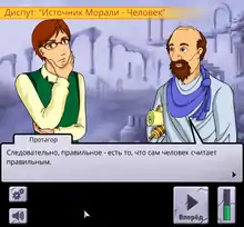 Claims by opponents are drawn from the "common ground" of what both the player-character Socrates and the opponent agree to be true. The opponent then builds on his claims in order to draw a conclusion. If a claim is vague, irrelevant or does not build up from the common ground, the player can question it. The players win a round when they challenge a statement made by their opponents with a counter-argument.[19][21] The game has a "chronological difficulty curve", which increases the challenge as players meet characters who lived more recently.[22]
