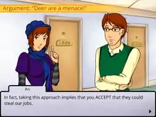 The designers noted during playtesting that there were alternative solutions to some of their puzzles. For instance, in the first round, the salesman comically argues that "deer steal our jobs", which the player is meant to counteract by asking for backing. Some players, however, presented the idea that "Deer live in the woods", arguing that they could not steal human jobs due to their location. The designers said this was a valid move and wrote into the game a customized response to it.[2][3] One important game mechanic is the ad hominem attack "Your face is ugly", which always fails in-game and was designed to teach players that this type of argument is unhelpful and flawed.[4] The game was designed to be more flexible and interactive than a book or film presentation of such philosophical debates.[4]