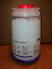This sequence of reactions explains the catalytic role played by sodium hydroxide in the system and why soda lime is faster in chemical reactivity than calcium hydroxide alone.[6] The moist NaOH impregnates the surface and the porosity of calcium hydroxide grains with a high specific surface area.[7] It reacts much more quickly and so contributes to a faster elimination of the CO2 from the rebreathing circuit. The formation of water by the reaction and the moisture from the respiration also act as a solvent for the reaction. Reactions in aqueous phase are generally faster than between a dry gas and a dry solid. Soda lime is commonly used in closed-circuit diving rebreathers and in anesthesia systems.[8][9]