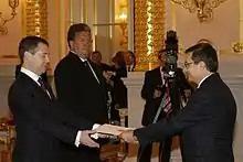 - "The ambassadors of ten countries presented their letters of credence to Dmitry Medvedev". The Kremlin, Moscow: Presidential Press and Information Office. 12 October 2009. Retrieved 28 February 2010.