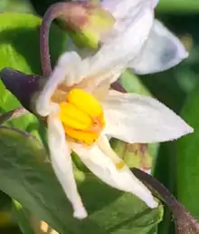 Solanum africanum is a perennial, herbaceous shrub or climber growing up to 3 meters tall.[2] The flowers are white to purple with a yellow centre, borne in pendulous clusters at the branch tips. The leaves are simple in shape, green, ovate to elliptic or lanceolate with acute apex, and the margin is often entire, but occasionally lobed. The fruit is a round berry, black when ripe, 15mm in diameter.