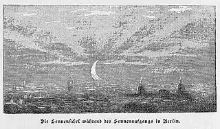 A total solar eclipse occurred on 19 August 1887. A solar eclipse occurs when the Moon passes between Earth and the Sun, thereby totally or partly obscuring the image of the Sun for a viewer on Earth. A total solar eclipse occurs when the Moon's apparent diameter is larger than the Sun's, blocking all direct sunlight, turning day into darkness. Totality occurs in a narrow path across Earth's surface, with the partial solar eclipse visible over a surrounding region thousands of kilometres wide. It was visible across Europe, Asia, and Japan.
