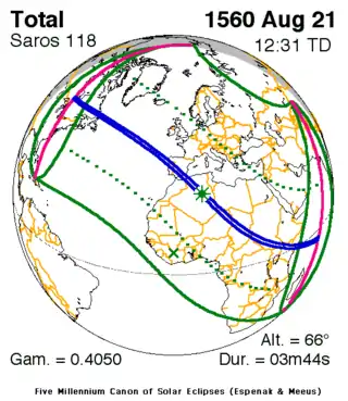 A total solar eclipse occurred on August 21, 1560. A solar eclipse occurs when the Moon passes between Earth and the Sun, thereby totally or partly obscuring the image of the Sun for a viewer on Earth. A total solar eclipse occurs when the Moon's apparent diameter is larger than the Sun's, blocking all direct sunlight, turning day into darkness. Totality occurs in a narrow path across Earth's surface, with the partial solar eclipse visible over a surrounding region thousands of kilometers wide.