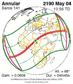 Solar saros 141, repeating every about 18 years, 11 days, and 8 hours, contains 70 events. The series started with partial solar eclipse on May 19, 1613. It contains 41 annular eclipses from August 4, 1739, to October 14, 2460. There are no total eclipses in this series. The series ends at member 70 as a partial eclipse on June 13, 2857. The longest annular eclipse occurred on December 14, 1955, with maximum duration of annularity at 12 minutes and 9 seconds. All eclipses in this series occur at the Moon’s ascending node.[9]
