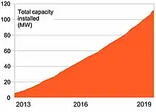 Although there are no subsidies, the declining costs of photovoltaics has caused a large increase in demand over the last few years. In 2009, the average turnkey price for a standard PV system of three kilowatts (kW) was about NZ$40,000; by 2019 this had dropped to approx. NZ$8,500.[3]