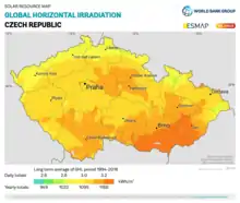 The Czech Republic had almost two gigawatts (GW) of photovoltaic capacity at the end of 2010, but installed less than 10 megawatts (MW) in 2011 due to the feed-in tariff being reduced by 25%, after installing almost 1,500 MW the year before. Installations increased to 109 MW in 2012.[1][2][3][4][5][6][7] In 2014, no new installations were reported.