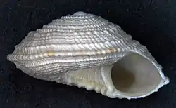 Solatisonax cabrali has a small, relatively thick-walled shell, with a maximum known diameter of 7.7 mm (0.30 in) and up to 5 whorls.[1] The outer surface of the shell is almost thoroughly ornamented by spiral and axial nodose cords and threads. Its outline changes along the ontogeny, from disk-shaped during the earliest stages of development to depressed cone-shaped in adult specimens. Similarly, the shell's basal region is more inflated than the upper side in younger specimens, but in adult individuals this relationship is inversed.[1] The dome-shaped, inflated protoconch is considered small for an architectonicid as defined by Bieler (1993),[3] ranging from 0.75 mm (0.030 in) to 0.88 mm (0.035 in) at 1.5 whorl. It has a glossy surface and a strong terminal varix marking the protoconch-teleoconch transition.[1] Shell color is variable from pale beige to white, with scattered beige spots. Since no living specimens of S. cabrali were collected to date, the operculum, as well as any details of the animal's soft parts are yet to be described.[1]