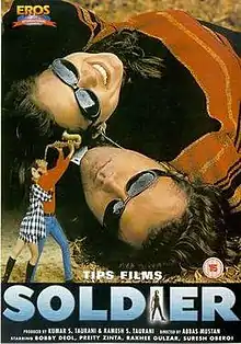 Soldier is a 1998 Indian Hindi-language thriller film directed by Abbas–Mustan starring Bobby Deol, Preity Zinta and Raakhee Gulzar. The film released on 20 November 1998 and was declared as a superhit by Box Office India, becoming the 2nd highest-grossing film of the year in India.[2] Although Soldier was Preity Zinta's first film, Mani Ratnam's Dil Se.. ended up being released before Soldier and was thus Zinta's film debut. Soldier was the first movie in Abbas-Mustan career, which was not a Hollywood remake or adaptation. According to film writer Shyam Goel, it was inspired by a real incident that happened in Punjab where a woman's forehead was branded with the message that her husband was a traitor. Her husband, a soldier, was accused of treachery, and she was thrown out of her village. The story was already made as a movie in Tamil in 1989 titled Thaai Naadu, starring Sathyaraj in dual roles. Then this film was remade in Dhallywood as Jamin Nai by Syed Harun starring Shabnur, Shakti Kapoor & Mizu Ahmed in lead roles in 2000 and Tamil as Villu by Prabhu Deva starring Vijay & Nayanthara in lead roles in 2009.