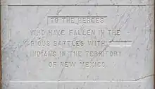The square plinth includes four inscribed panels, three of which memorialized Union soldiers who died on the battlefields of New Mexico Territory in the American Civil War. The fourth panel on the monument memorialized US soldiers who died "in the various battles with savage Indians." The word "savage" was chiseled-off by an anonymous person in 1974.[3] On October 12, 2020, Indigenous People's Day the obelisk portion of the monument was toppled by protestors.[4]