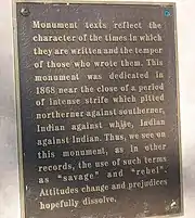 "Monument texts reflect the character of the times in which they are written and the temper of those who wrote them. This monument was dedicated in 1868 near the close of a period of intense strife which pitted northerner against southerner, Indian against white, Indian against Indian. Thus, we see on this monument, as in other records, the use of such terms as ‘savage’ and ‘rebel’. Attitudes change and prejudices hopefully dissolve."