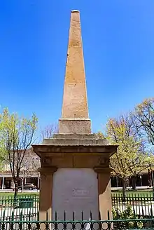 The Soldiers' Monument is a controversial memorial monument at the center of the Santa Fe Plaza. It was erected as a 33 feet (10 m) stone cenotaph, consisting of an obelisk and a plinth during 1867–1868. During the late nineteenth century, the monument was used for annual Memorial Day events, a place for Union veterans to gather, decorate the cenotaph, and hear brief presentations.[1][2]
