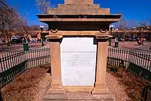The monument consists of a stone obelisk with four engraved marble panels on the stone base commemorating U.S. soldiers who died in battles in New Mexico. It is located in the central area of the Santa Fe Plaza in downtown Santa Fe.[9] The monument has a stone foundation; a locally produced brick and lime core plinth; local stone inscribed panels; imported Italian marble trim with marble columns and marble wreathes (Victorian funerary motifs), and marble obelisk. The cenotaph, with its Egyptian architectural associations, is 33-feet tall.[7][10] Builders were McGee & Brother (John and Michael McGee), architects, master stone cutter Tomas Baca, and local craftsmen.[11] The stone panels were inscribed by local craftsmen.[12]
