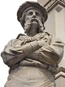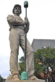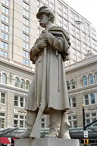 The Lancaster Soldiers and Sailors Monument features a 43-foot (13 m) tall Rhode Island, rectangular granite pillar topped with a statue of a robed woman on a pedestal known as the "Genius of Liberty".[2] The Genius of Liberty holds a drawn sword and a shield.[2] Her head is crowned with stars.[2] She faces north which, according to legend, allows her to turn her back on the former Confederate States of America, which were defeated in the war.[2]