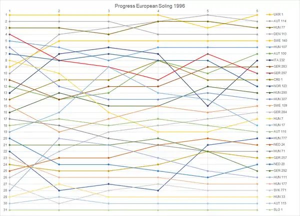 JESPER BANK'S EUROPEANS" (PDF). soling.com. International Soling Association. Retrieved 26 January 2022.{{cite web}}: CS1 maint: date format (link) CS1 maint: url-status (link) - "Soling European Championship" (ASCII). site-isaf.soticcloud.net. World Sailing. 19–27 September 1996 [1995]. Retrieved 27 January 2022.