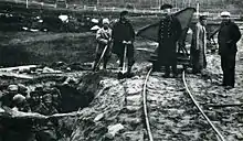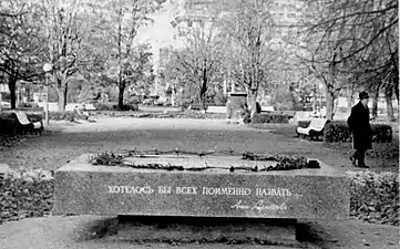 The idea of commemorating the victims of Soviet repression was first publicly proposed in October 1961 at the 22nd Congress of the Communist Party of the Soviet Union. When Nikita Khrushchev's program of De-Stalinisation ended in 1964, however, such a concept was abandoned and in the post-Khrushchev era political dissidents were once again repressed.[30] The idea persisted among Soviet dissidents during the 1970s.[31] In the 1980s, during perestroika, the policy of democratization and a relaxation of censorship finally allowed open discussions of the previously forbidden topic of State Terror.[32] At the end of the 1980s, the Memorial society was established. One of its major tasks was to commemorate the victims of political repression. At first it made a start only in Moscow, but after the St. Petersburg branch was founded in 1988 it became an active participant of the society's work.[33][34][35]