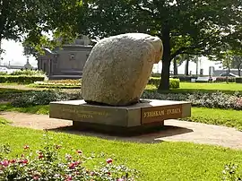 Petersburg's Solovki Stone was designed by artists Yuly Rybakov and Yevgeny Ukhnalyov (the latter devised Russia's national coat of arms).[50] Both had suffered political repression during the Soviet period.[20][31] The monument was funded by donations, mostly from former political prisoners and their families. NGOs such as Memorial and Civil Control [grazhdanskaya kontrol], and the Union of Right Forces political party, made substantial contributions.[53][23][31][50] During their expedition to Solovki to select a suitable boulder Rybakov, Ukhnalyov and Flige found a massive granite slab near the former Savvatyev Skethe (hermitage). Transporting the hefty 10,400 kilograms [22,900 lb] boulder to St. Petersburg was a challenge but they were assisted by local fishermen and industrial workers and by the staff of the Solovki museum.[12][20][31]