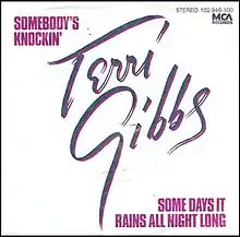 "Somebody's Knockin'" is a song recorded by American country music singer Terri Gibbs. It was released in October 1980 as her debut single and title track from her album Somebody's Knockin'. It was co-written by Jerry Gillespie and Ed Penney. Penney was a record company executive who liked Gibbs's voice when he first heard her audition tape, but felt she needed stronger material.[2] Penney was a former Boston disc jockey who had promoted records and written a number of songs before moving to Nashville.[3] He was the producer of "Somebody's Knockin'" and became Terri Gibbs's manager.[4]