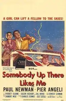 Somebody Up There Likes Me is a 1956 American drama film directed by Robert Wise and starring Paul Newman and Pier Angeli, based on the life of middleweight boxing legend Rocky Graziano.[3][4] The supporting cast features Everett Sloane, Eileen Heckart, Harold J. Stone, Sal Mineo, and Robert Loggia. Steve McQueen has a small but memorable unbilled role as Fidel.