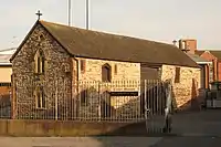 The building, which is within the confines of the County Ground, is the Old Priory Barn, a Grade II* listed building. It is the only surviving building of the Augustinian Taunton Priory which was founded about 1115,[1] although there is some evidence that its early use was not as a barn but as a guesthouse or quarters for a Priory official.[2] The local stone rubble has been repaired with red brick and has a tie-beam roof covered with tiles. The door and window openings are made of Bishops Lydeard stone.[3] The exact dates of the building are disputed, but is argued to be from the late 15th or early 16th century,[4] and replacing an earlier 13th or 14th-century building on the site, but incorporating some of the earlier building.[5] It was a Scheduled Ancient Monument until 1999 when it was descheduled.[6] The building was once used as a chapel by Frenchmen, possibly prisoners during the French Revolutionary Wars or Napoleonic Wars.[4]