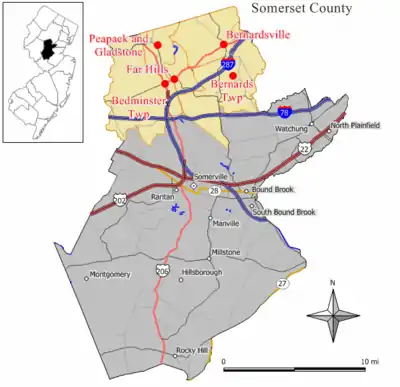 The Somerset Hills is known as the northern region of Somerset County located in the U.S. state of New Jersey and includes the municipalities of Bedminster, Bernardsville, Bernards Township, Far Hills, Peapack & Gladstone. The Morris County communities of the Chesters (borough and township) and the Mendhams (borough and township) are often considered part of the Somerset Hills.[1]