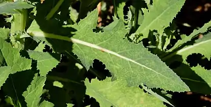 The shore puha has green leaves extending upwards with spiky sides. On the top is a yellow flower. The shore puha can grow up to 15-30 centimeters tall. Occasionally it grows up to 100 centimeters.[5]