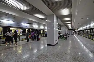 Songhong Road (Chinese: 淞虹路; pinyin: Sōnghóng Lù) is a station on Line 2 of the Shanghai Metro in Changning District.[1] The station served as the western terminus of the line from 30 December 2006, when Line 2 was extended westward from Zhongshan Park,[2][3] until 16 March 2010, when the second westward extension to the current terminus at East Xujing opened.[2][4] The station is still often used as a terminus for west-bound trains meaning passengers have to disembark and wait for another train for the remainder of the journey.